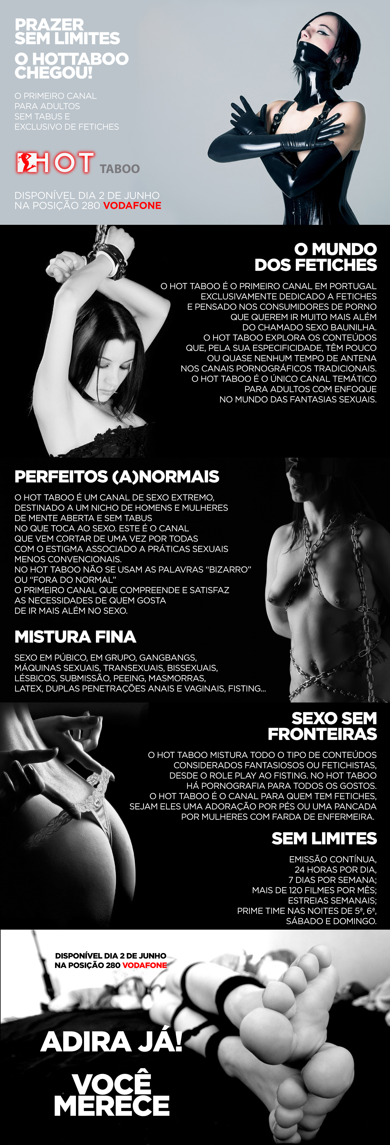 O canal HOT TABOO é um canal pornográfico "dedicado ao fetiche e pensado nos consumidores de porno que querem ir muito mais além do chamado sexo baunilha".